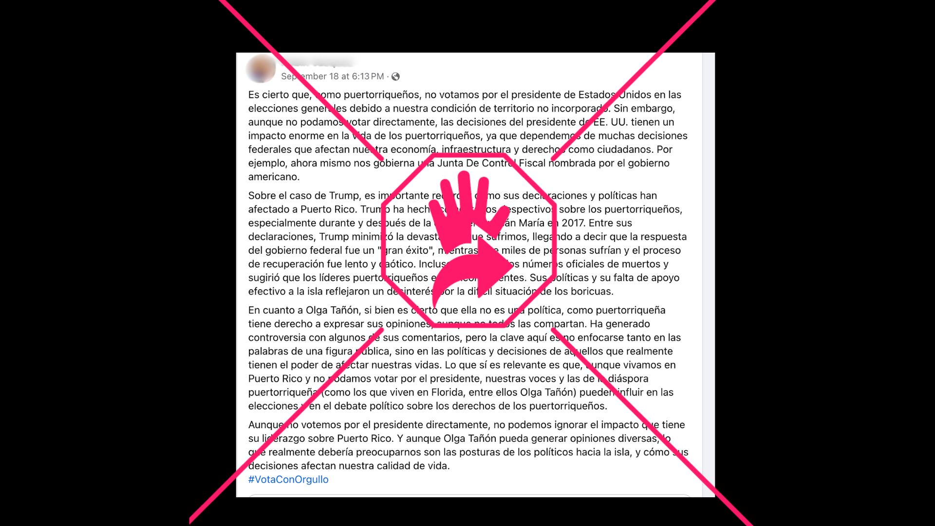 “Es cierto que, como puertorriqueños, no votamos por el presidente de Estados Unidos en las elecciones generales debido a nuestra condición de territorio no incorporado”, se lee en una publicación compartida por un usuario en Facebook el 18 de septiembre de 2024.