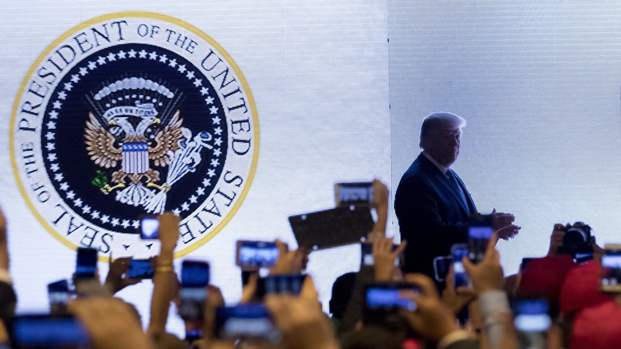 El presidente Trump asistió a una cumbre de estudiantes de Turning Point USA, allí apareció junto a una modificación del escudo presidencial que incluía una frase en español.