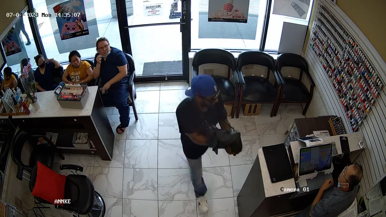 La cámara de seguridad de un salón de manicura de Atlanta captó el momento en el que un hombre entró gritando y exigiendo a los presentes en el local vaciar sus bolsillos y tirarse al suelo. Sigue las últimas noticias en Univision.