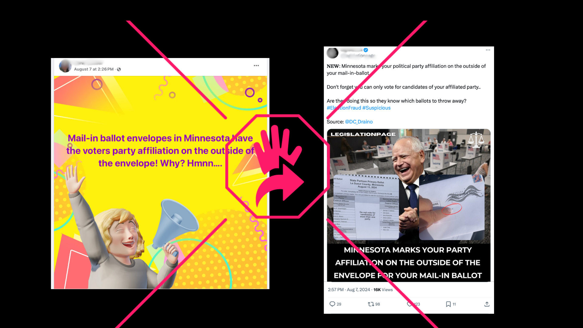 En medio de las elecciones primarias en Minnesota, circulan publicaciones en X y Facebook que afirman que, en el estado gobernado por el demócrata y virtual candidato a la vicepresidencia de Estados Unidos, Tim Walz, se muestra la afiliación política en el exterior del sobre de la boleta electoral por correo. Sin embargo, esto es falso. Un funcionario público de Minnesota desmintió esta afirmación y explicó a elDetector qué es lo que realmente muestra el sobre.