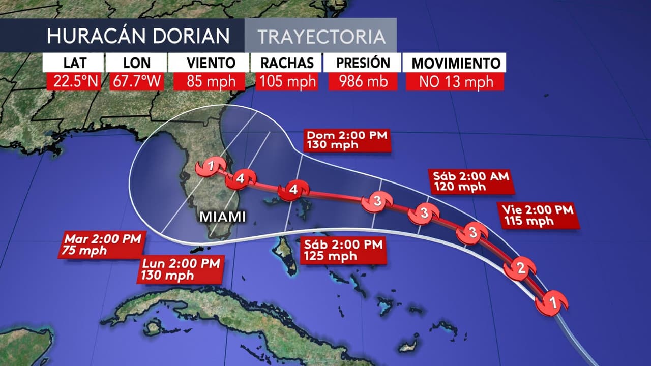 Dorian se sigue fortaleciendo en el Océano Atlántico con vientos máximos sostenidos de 85 millas por hora; es decir, categoría 1. Aunque todavía es muy pronto para determinar dónde tocará tierra en la costa este de EEUU, los modelos coinciden en que cuando llegue a Florida será de categoría 4, es decir de vientos de al menos 130 millas por hora.