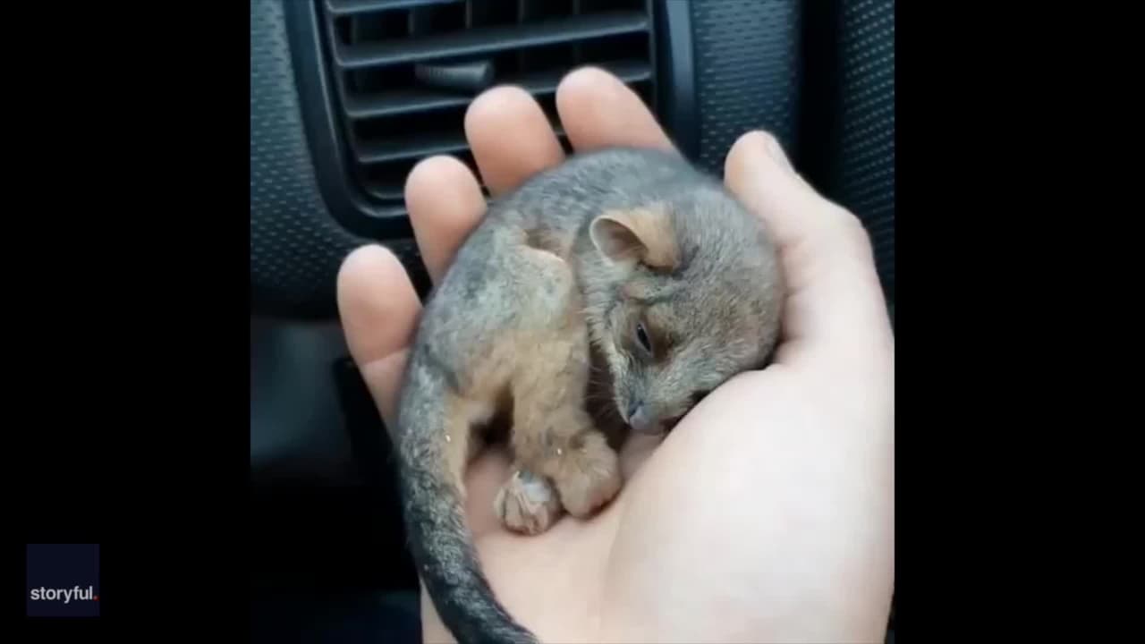 Rescata a una zarigüeya bebé abandonada, la reanima y la calienta con la calefacción de su auto