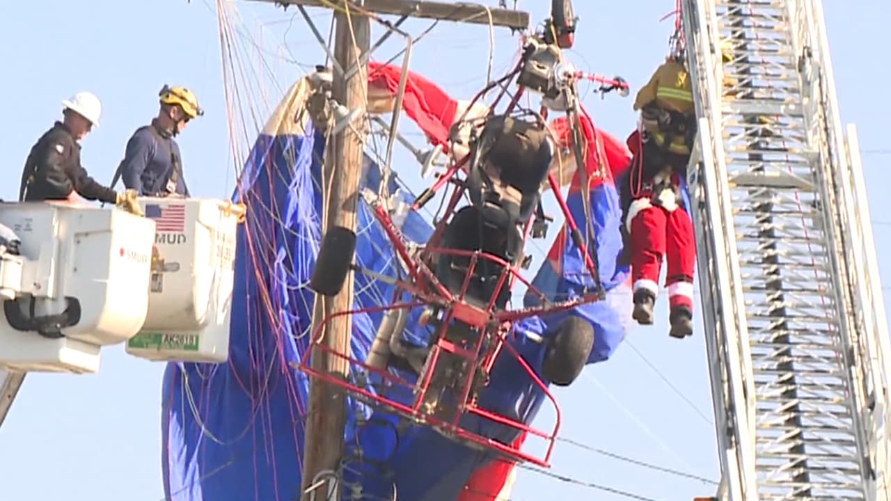 Un hombre disfrazado como Papá Noél tuvo que ser rescatado en Rio Linda, cerca de Sacramento, California, cuando su parapente a motor quedó atascado en una torre eléctrica ante la incrédula mirada de todo el vecindario.