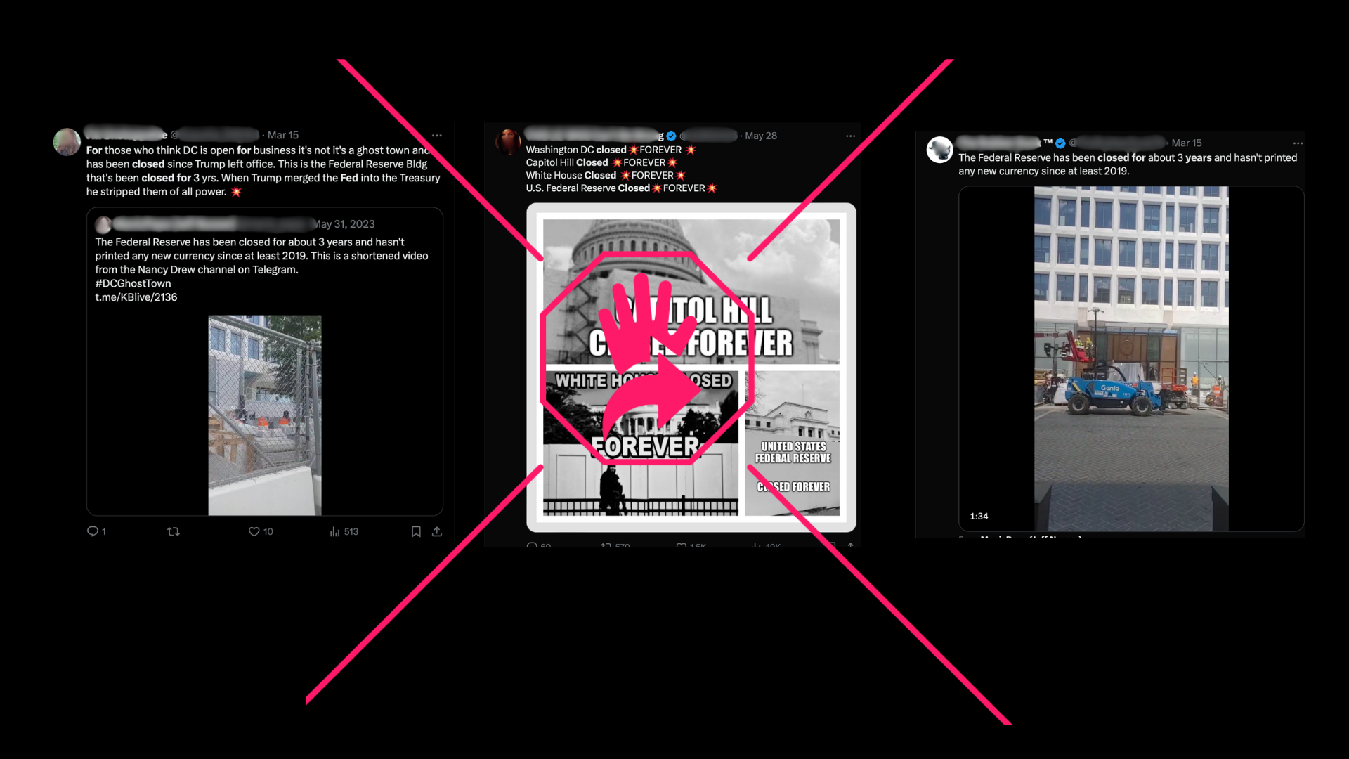 Meses antes, el 17 de marzo, un post en Facebook señaló que “La Reserva Federal lleva cerrada casi tres años y no imprime dinero desde 2019”, con una imagen de un edificio cubierto. Publicaciones similares también han sido compartidas en inglés.