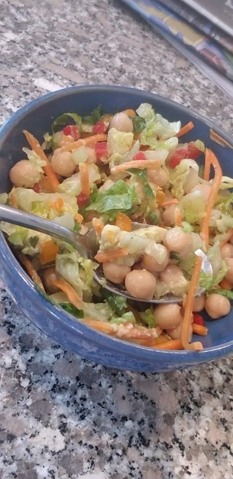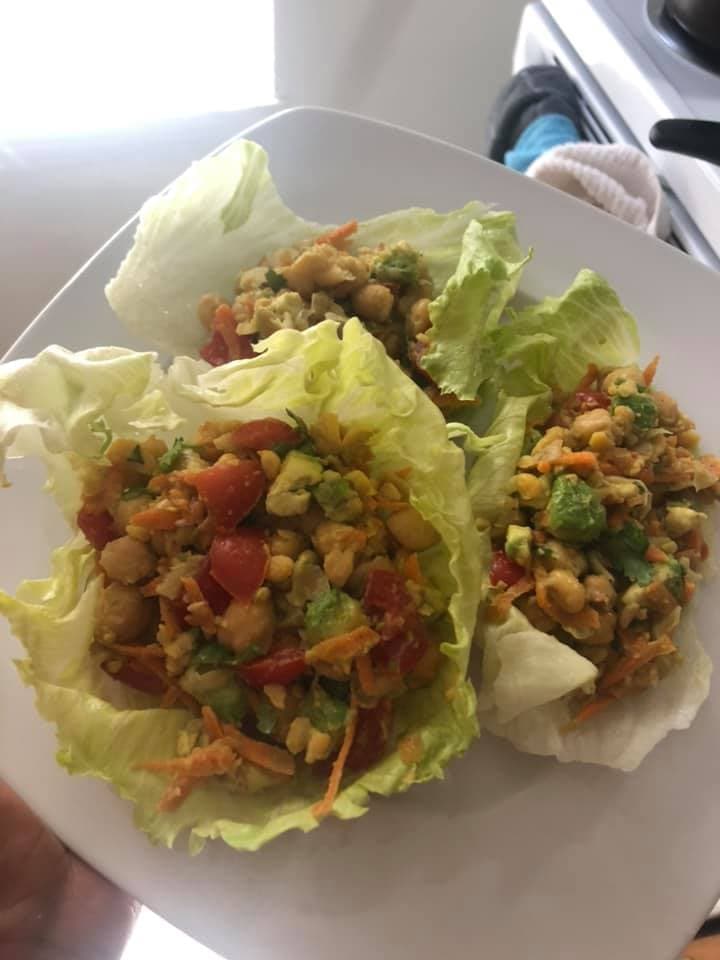Extiende la hoja de lechuga y ponle en el centro ½ taza de ensalada de garbanzos.