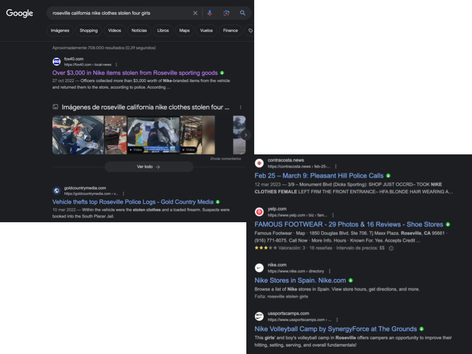 Google. Búsqueda con las palabras clave, en inglés, “Roseville California ropa nike robada cuatro chicas“. Consultado el 23 de agosto de 2023.