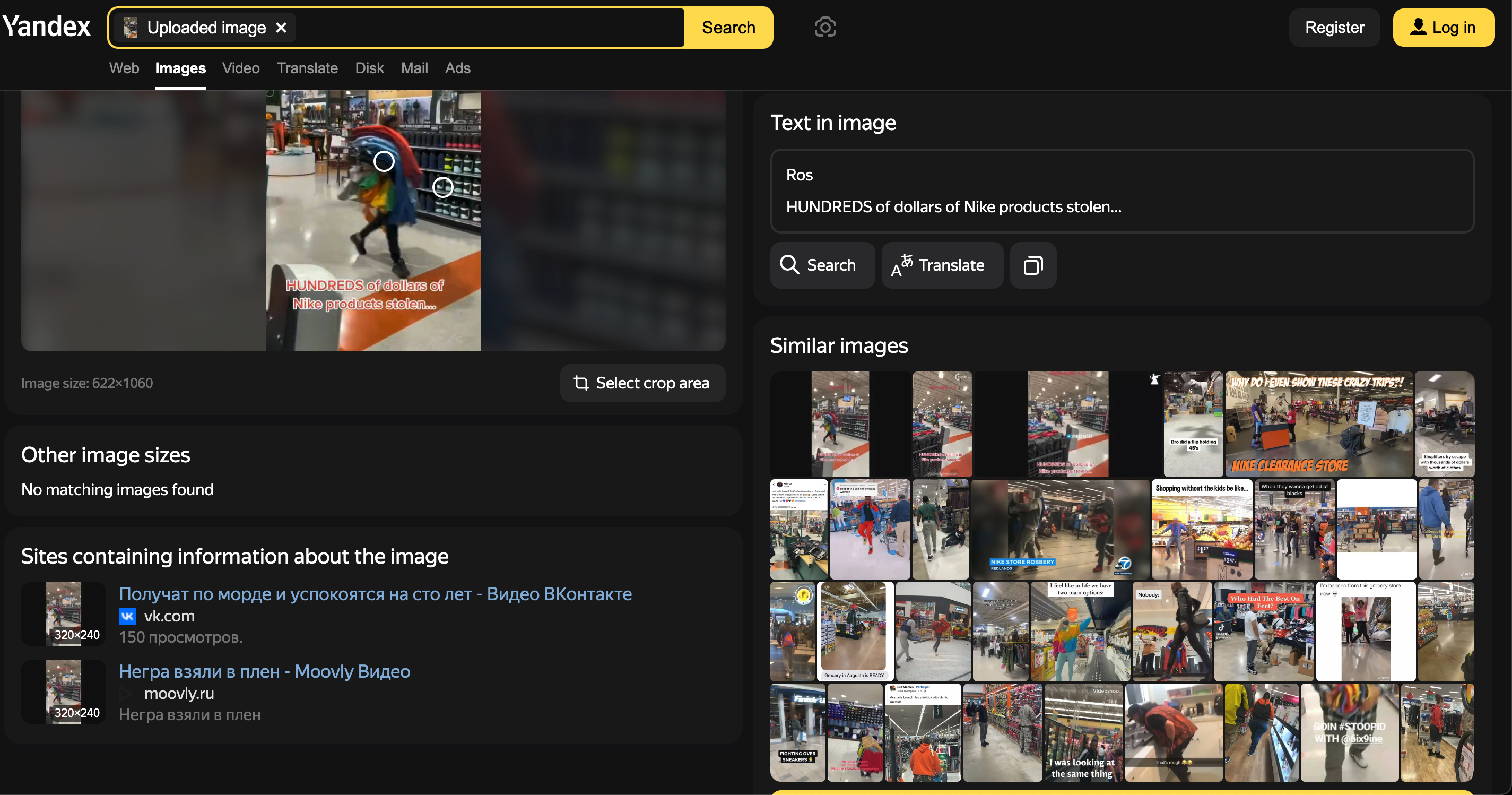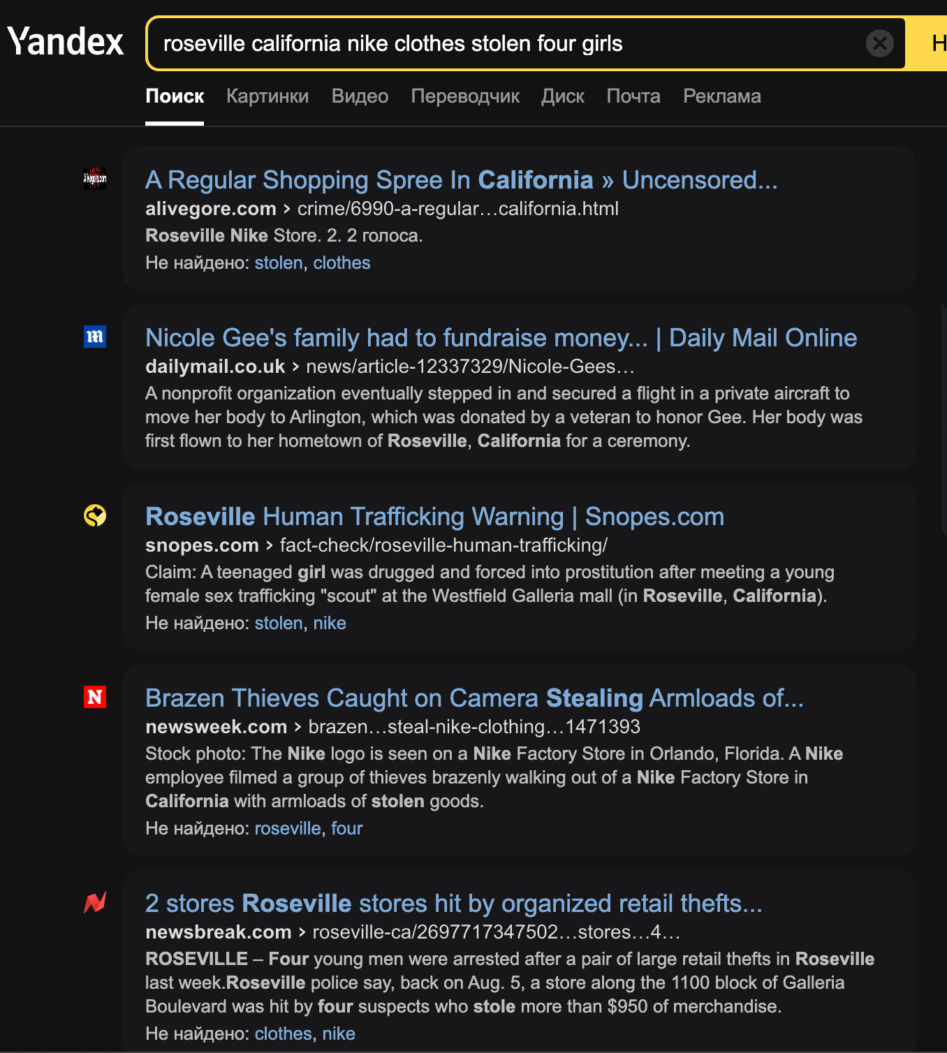 Yandex. Búsqueda con las palabras clave, en inglés, “Roseville California ropa nike robada cuatro chicas“. Consultado el 23 de agosto de 2023.