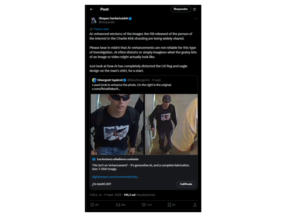 Las IA como Gemini, ChatGPT, entre otras, no suelen ser confiables para mejoras en imágenes ya existentes. Shayam Sardarizadeh, factchecker de BBC Verify , señaló en X que “la IA a menudo distorsiona o simplemente imagina cómo podrían verse realmente las partes granuladas de una imagen o video”. Shayam explicó con un ejemplo lo que ocurrió con la bandera y el águila en la playera del autor del asesinato de Kirk en las imágenes que circulan en redes sociales, que también fueron redibujadas.