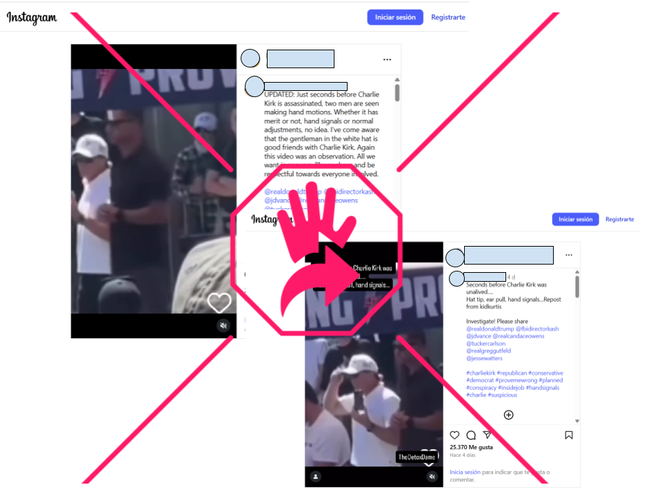 “Justo segundos antes de que Charlie Kirk fuera asesinado, se ve a dos hombres haciendo gestos con las manos. No sé si tienen algún significado, si son señales con las manos o simples ajustes normales… solo queremos respuestas”, se lee en la descripción de una de las publicaciones.