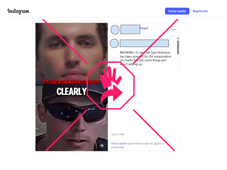 Circula en Facebook e Instagram un video, en diferentes versiones, en el que hacen una supuesta comparación entre las fotos difundidas, previo a la detención del sospechoso de asesinar a Charlie Kirk, y las que han ido surgiendo (como la del mismo arresto) luego de que se conociera su identidad, para afirmar sin evidencias que la persona detenida y la que captaron las cámaras de seguridad en el campus de Utah, no son la misma.