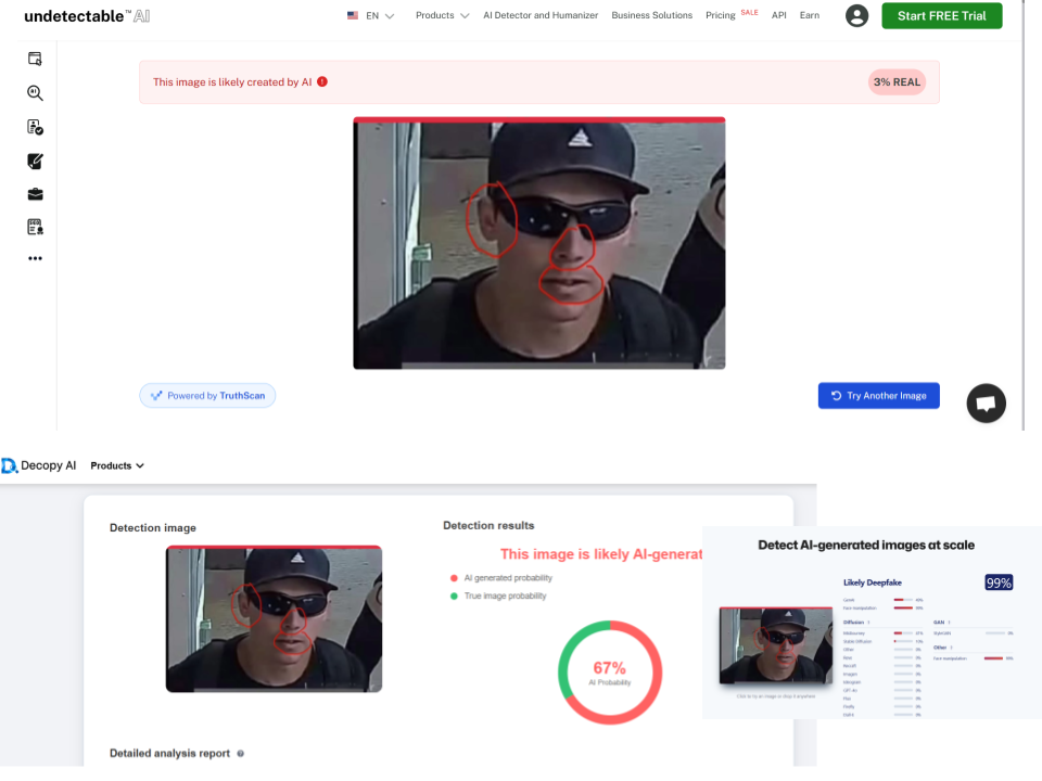 Al chatbot de elDetector nos llegó un comentario de que las personas estaban usando Gemini, la IA de Google, para supuestamente mejorar la calidad de la imagen original proporcionada por las autoridades.. Por ello, pasamos la fotografía que afirman en redes que es diferente (y que aseguran viene de las cámaras de seguridad y del FBI) por tres distintas herramientas gratuitas de detección de inteligencia artificial (IA): Decopy AI, Undetectable.AI y SigthEngine. Todas esas plataformas dieron positivo a IA.