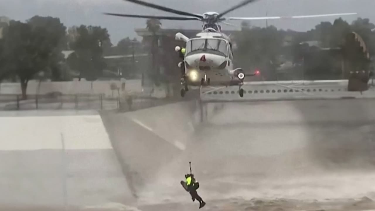 Un helicóptero del Departamento de Bomberos de Los Ángeles rescató al hombre atrapado en el arroyo Pacoima Wash, crecido por las fuertes lluvias que deja el río atmosférico a su paso por California. Sigue las últimas noticias en Univision.