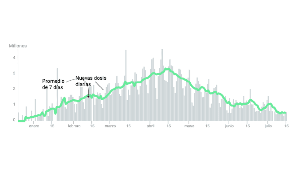 El ritmo de vacunación ha caído significativamente a poco más de 500,000 dosis diarias en promedio en comparación con su pico de abril de 3.3 millones. Esto no solo implica que menos gente se está protegiendo, también abre el camino para que surjan nuevas variantes, ha dicho Walensky.