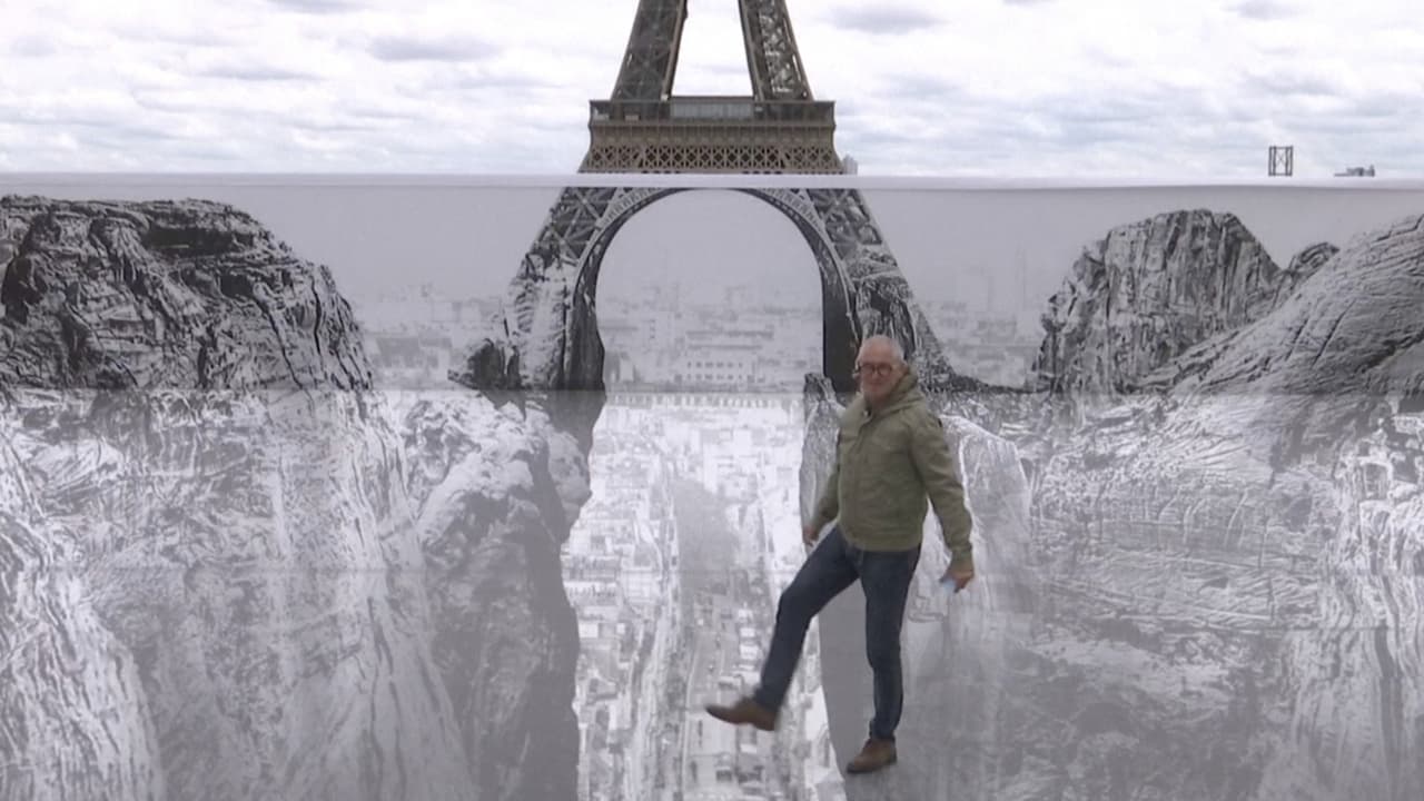 El artista contemporáneo francés Jean René (JR) dio a conocer su última instalación de arte, que juega con la ilusión óptica y ofrece una impresionante imagen de acantilados debajo de la Torre Eiffel.