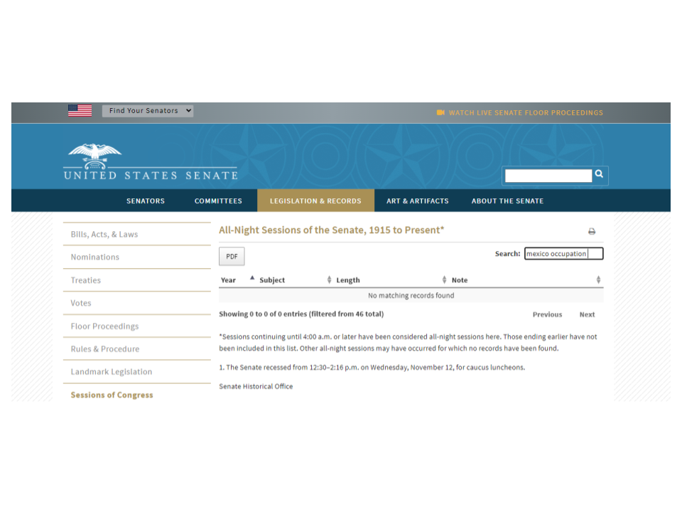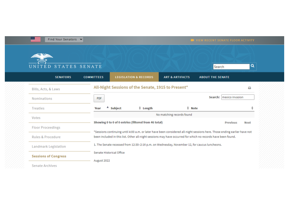 Con una búsqueda con palabras clave en Google (en inglés y español), no hallamos noticias o informaciones oficiales sobre el supuesto análisis por parte del Senado estadounidense de una invasión a México. De haberse hecho una propuesta así, como falsamente afirman en redes sociales, habría notas de análisis o reacciones de la comunidad internacional. Hicimos también una búsqueda avanzada en las sesiones del Senado con las palabras clave en inglés Mexico invasion, Mexico invade y Mexico occupation, y no hay registro de ninguna discusión que incluya esos términos.