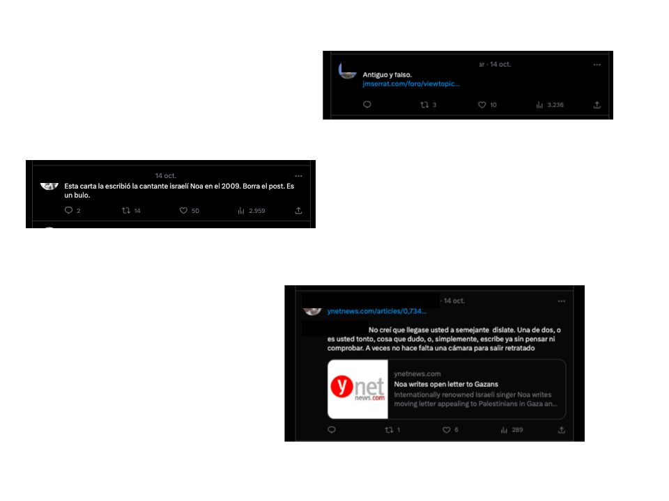 En elDetector encontramos que entre los comentarios de la publicación viral en X, varios usuarios apuntan que el texto es viejo y que realmente fue escrito por la cantante israelí Noa en 2009, aunque ese mismo año comenzó a correr la desinformación de que era de la autoría de Serrat.
