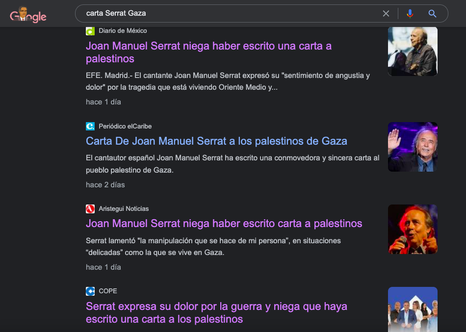 Además de que con todo lo anterior queda establecido que el escrito no es actual, encontramos (a través de una búsqueda por palabras clave en Google) que Serrat aseguró a la agencia EFE en octubre de 2023 no ser el autor de una carta dirigida a los palestinos de Gaza en el marco del actual conflicto armado entre Israel y Hamas.