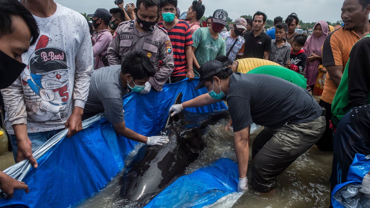 Solo tres de las 45 ballenas varadas en aguas poco profundas de Indonesia pudieron ser rescatadas