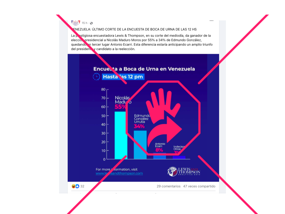 Durante la jornada electoral del domingo 28 de julio en Venezuela fue difundida en redes sociales una supuesta encuesta a boca de urna que aseguraba que hacia la mitad del día el presidente Nicolás Maduro encabezaba las votaciones con un 55% de los sufragios. Las publicaciones señalaban que el sondeo fue hecho por la “prestigiosa encuestadora Lewis & Thompson” y referían a su página web para obtener más información. Sin embargo, es falso que esa sea una firma de renombre: su sitio web fue creado 18 días antes de los comicios venezolanos y no estaba disponible al día siguiente; además, no aparece citada en medios reconocidos ni en los ránkings de sitios especializados.