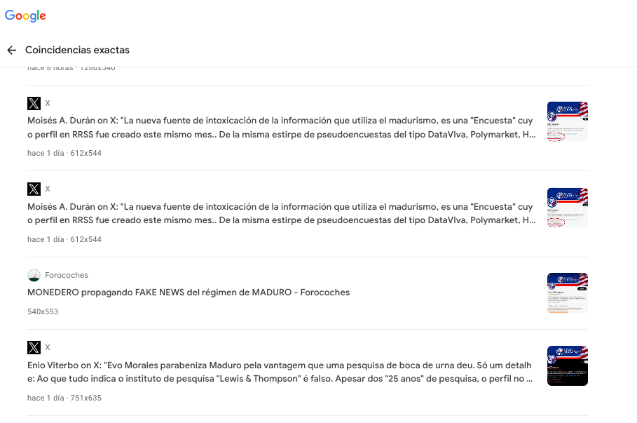 Verificadores locales de Efecto Cocuyo, que sí pudieron ingresar el 28 de julio a la web que se proporcionaba en las publicaciones que estamos chequeando, concluyeron también que Lewis & Thompson no es una “firma legítima”. Entre otras cosas, señalaron que su sitio web “no ofrece teléfono, correo electrónico o dirección completa, ni nombre de trabajadores o directivos”, decía que la compañía tiene 25 años de experiencia y solamente mostraba un puñado de presuntos sondeos con fechas no anteriores a 2020 e incluso mezclaba idiomas en el contenido publicado.