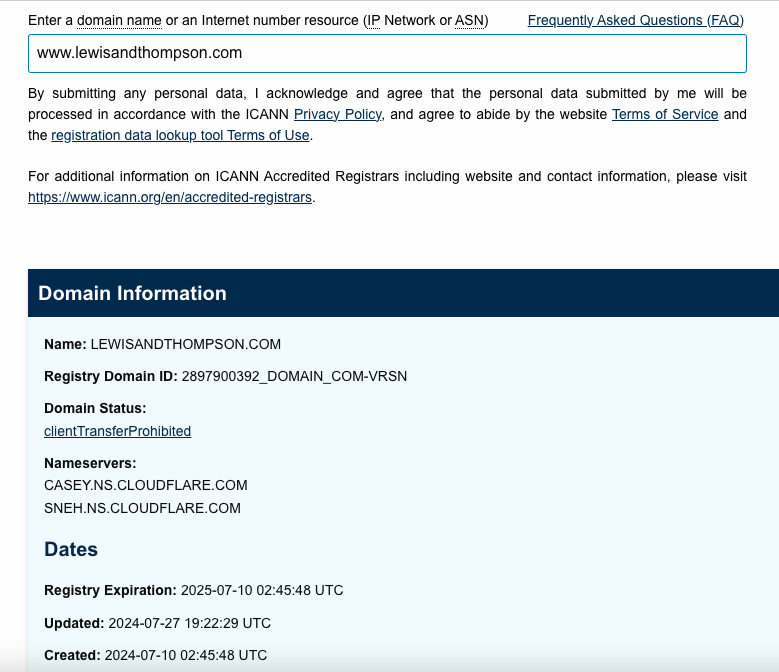 Entonces, introdujimos el nombre de dominio en la Corporación de Internet para la Asignación de Nombres y Números (ICANN, por sus siglas en inglés) y encontramos que la web fue creada el 10 de julio de 2024 y actualizada el 27 de julio del mismo año (solo un día antes de los comicios venezolanos).