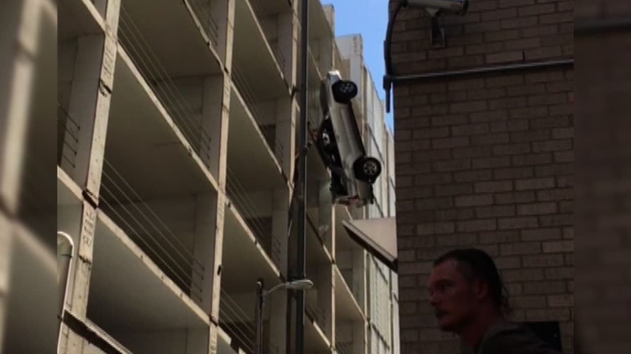 En video: un hombre escapa de un auto que quedó colgando de un noveno piso