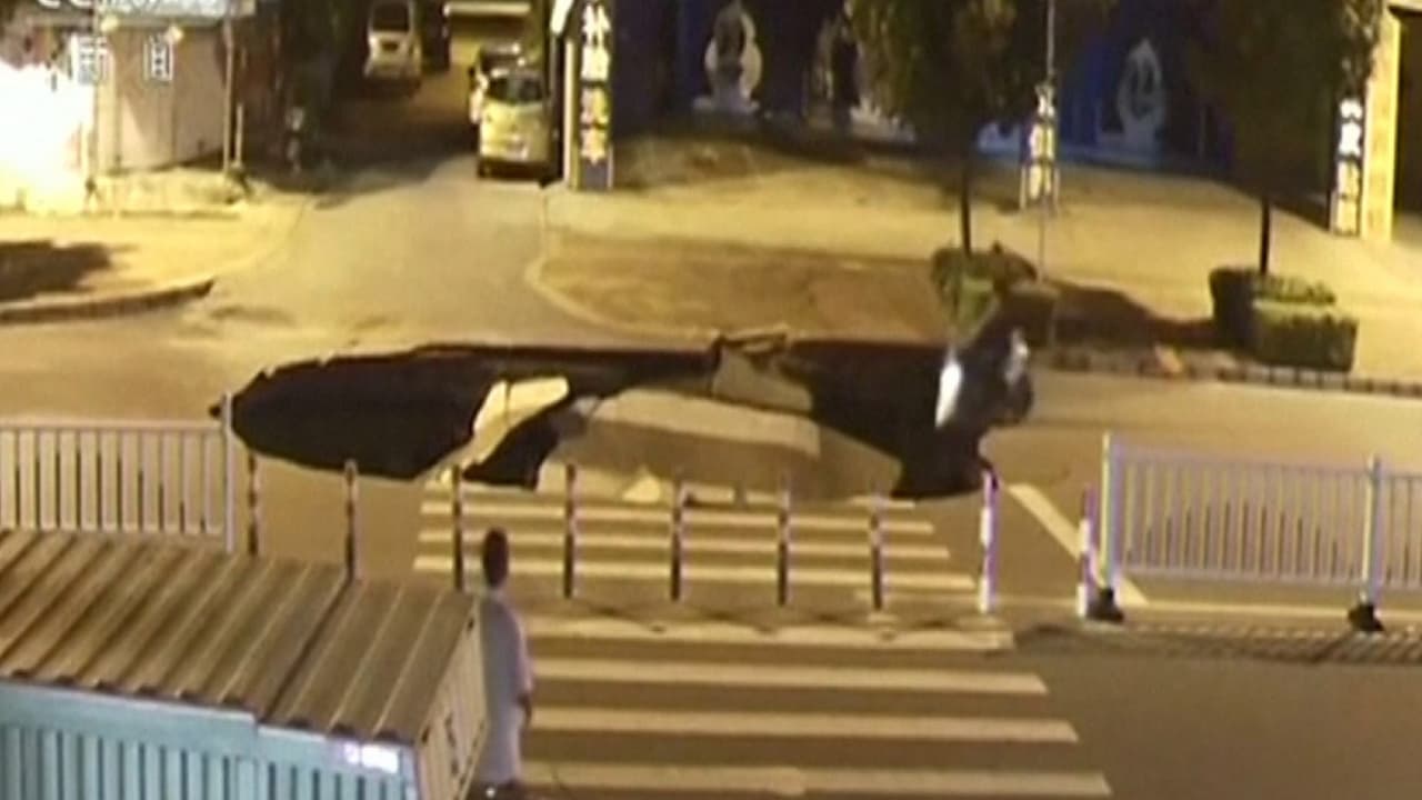 Un conductor cayó con su moto en un inmenso socavón que se produjo de forma natural en una carretera de Beihai, en China. Afortunadamente, el motorista salió ileso del hoyo, según la televisión estatal.