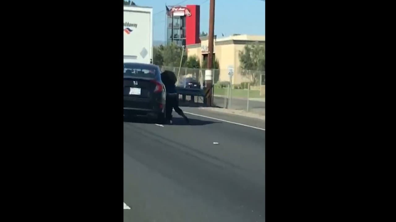 Dos conductores en Santa Ana, California, grabaron a una mujer agarrándose de la puerta de un auto en movimiento. La policía ha dicho que investiga el incidente.