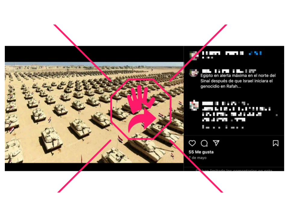 Es falso que esos tanques con la bandera de Egipto que se ven en una foto se encuentren “en alerta máxima” en la zona del Sinaí, fronteriza entre ese país e Israel, tras la entrada del ejército israelí en Rafah, como dice la publicación en redes. Una búsqueda inversa de la imagen en Google arroja varias publicaciones de julio 2017 en las que aparece la misma fotografía. Es decir, ya circulaba seis años antes del inicio del actual conflicto entre Israel y Hamas, por lo que la imagen está fuera de contexto. Lee aquí cómo escogemos y asignamos nuestras etiquetas en elDetector.
