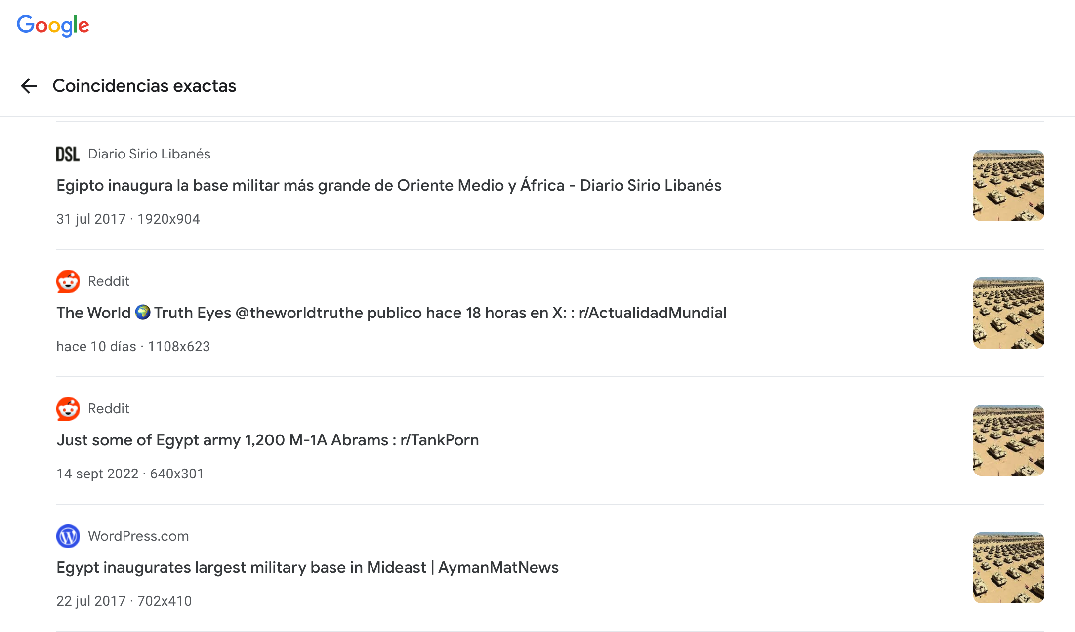 Una búsqueda inversa en Google de la imagen que circula en redes revela que ha sido compartida, al menos, desde julio de 2017. Así lo confirman varias publicaciones, una de las cuales señala que la foto se hizo durante la inauguración de una base militar en la zona del Sinaí por esas fechas. Es decir, la instantánea, aunque real, no es actual ni tiene ninguna relación con la guerra entre Israel y Hamas iniciada en octubre de 2023.