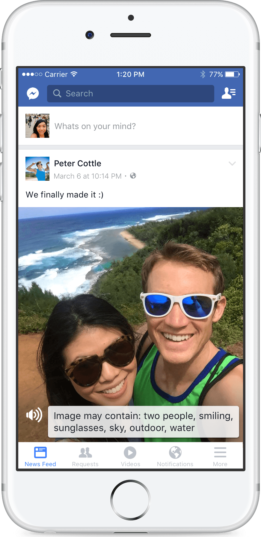 “Hoy el contenido visual está fuera del alcance de la gente que no ve”, dice Matt King, un ingeniero de Facebook que es ciego y trabajó en el desarrollo de esta función. “Este tipo de tecnología es nueva y extremadamente apasionante”.