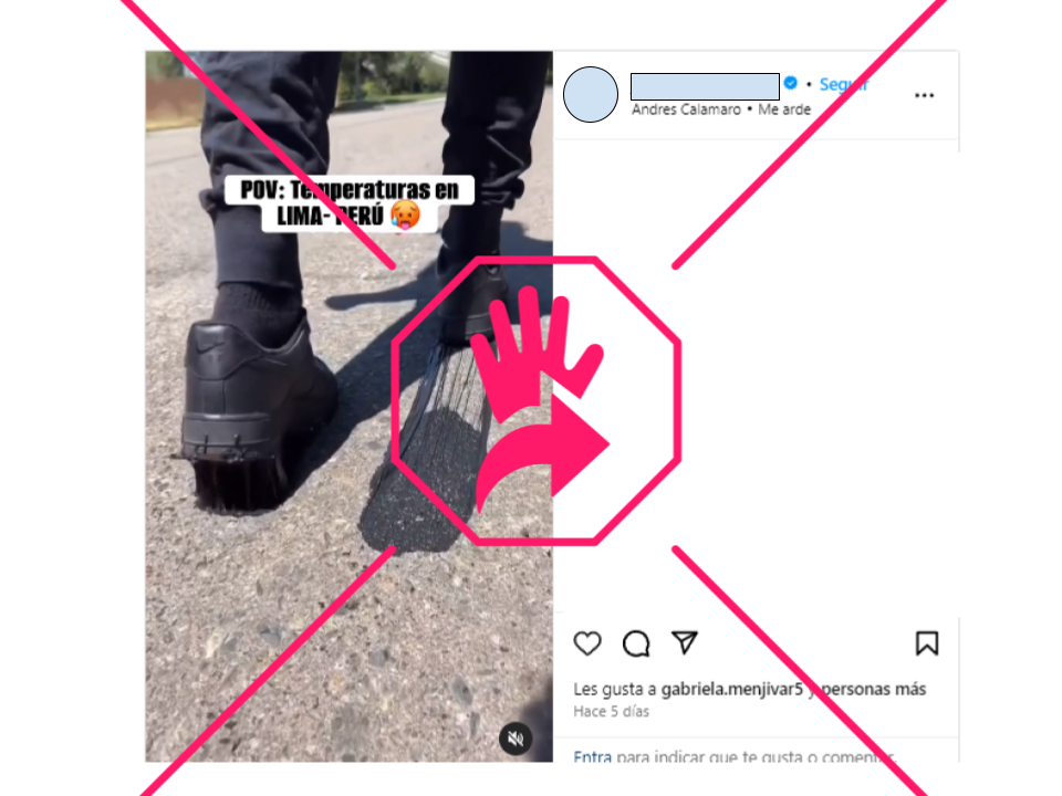 Circula un video en Instagram en el que se ven las piernas de una persona que camina sobre el asfalto. La suela de sus zapatos deportivos parece derretirse un poco en cada paso y el texto que acompaña la grabación dice: “Está caliente en Perú”. Pero es falso que las temperaturas actuales en ese país ocasionaran la apariencia pegajosa de esas suelas. El video circula, al menos, desde 2023 y la temperatura necesaria para derretir una suela, según informan expertos, está muy lejos de las registradas en Perú.