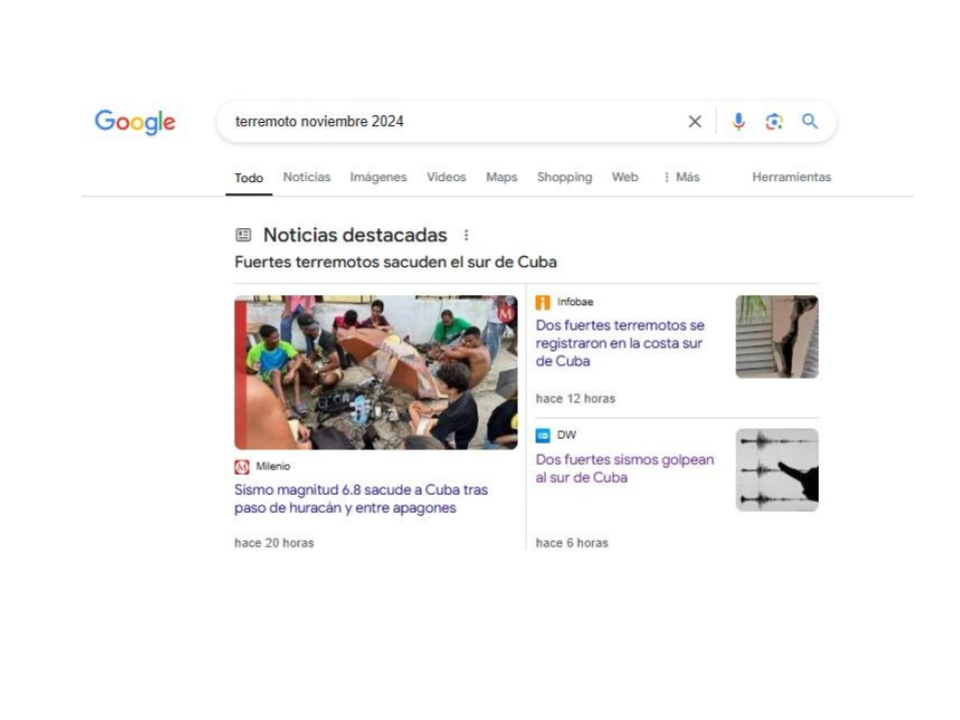 Otra búsqueda con palabras clave ( terremoto noviembre 2024) nos llevó a múltiples informaciones sobre dos terremotos de magnitud 5.9 y 6.8 que ocurrieron en Cuba este domingo 10 de noviembre de 2024. Ninguno en México, ni de magnitud 7.4. Univision Noticias también reportó el terremoto en la isla.