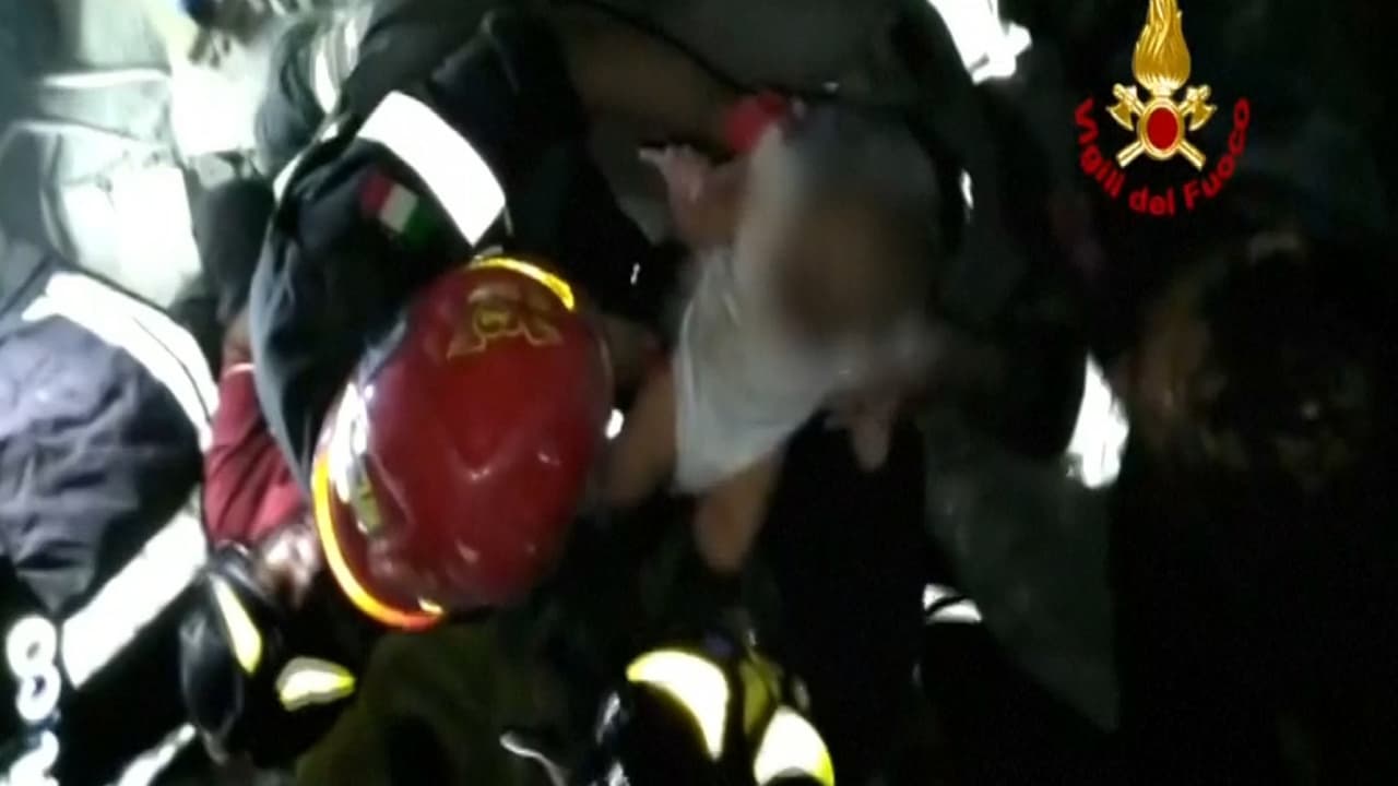 El momento en que bomberos rescatan a bebé llorando de las ruinas tras terremoto en Italia