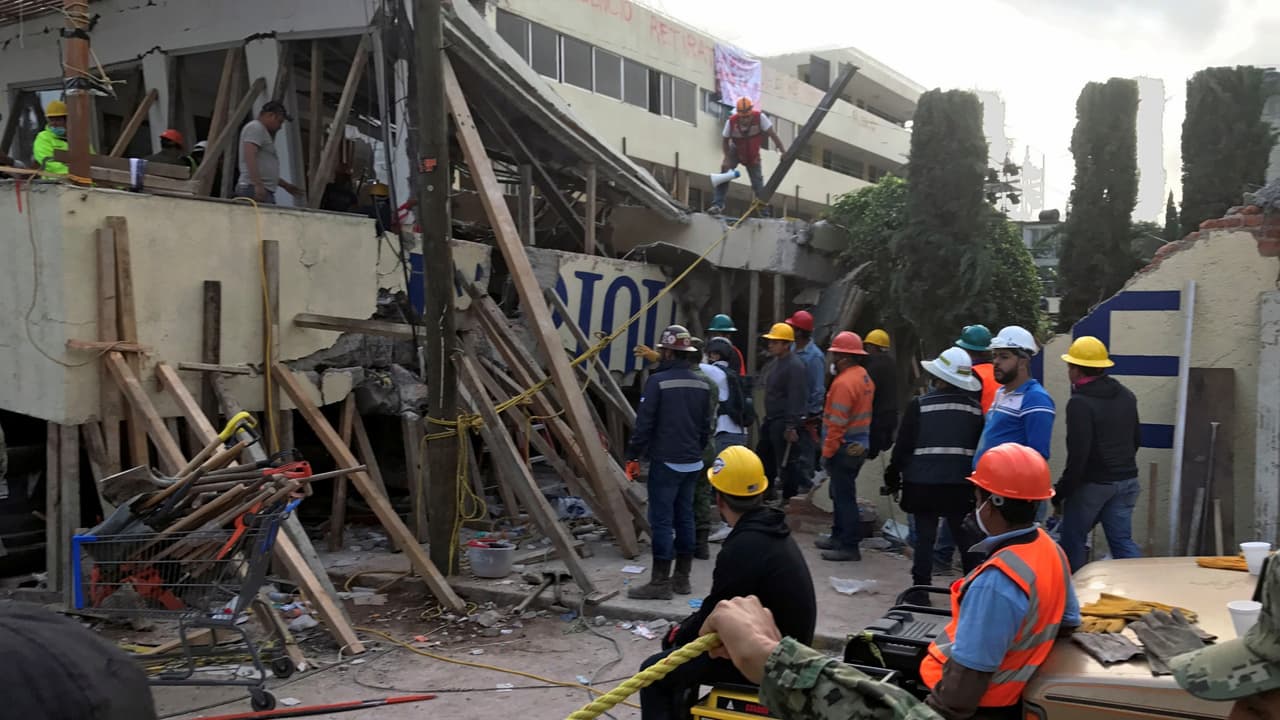 Desde la madrugada, los rescatistas buscan a una niña bajo la enorme losa de concreto que tapió las áreas administrativas y de talleres del colegio. Horas después las autoridades informaron que hay otros tres adolescentes con vida atrapados.