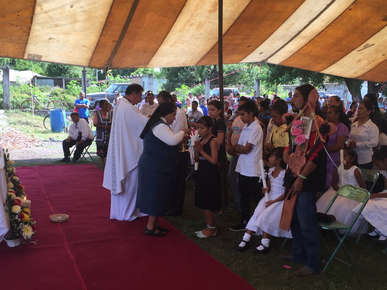 La misa de este domingo 24 se celebró bajo una carpa, en el terreno baldío que está frente a las ruinas de la Iglesia Santiago Apóstol. Vinieron monjas de Puebla, la capital, y gente de los caseríos cercanos. Las sillas que llevó la alcaldía fueron insuficientes, hubo vecinos que llevaron las suyas y otros se quedaron rezando de pie y en el sol.
