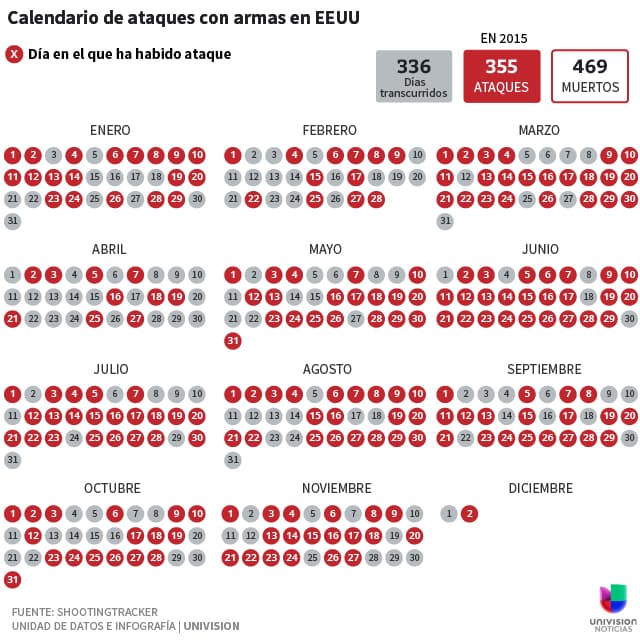 En 2015 solo, hubo más ataques masivos y muertos que días del año, como informó el equipo de #dataviz de Univision Noticias.