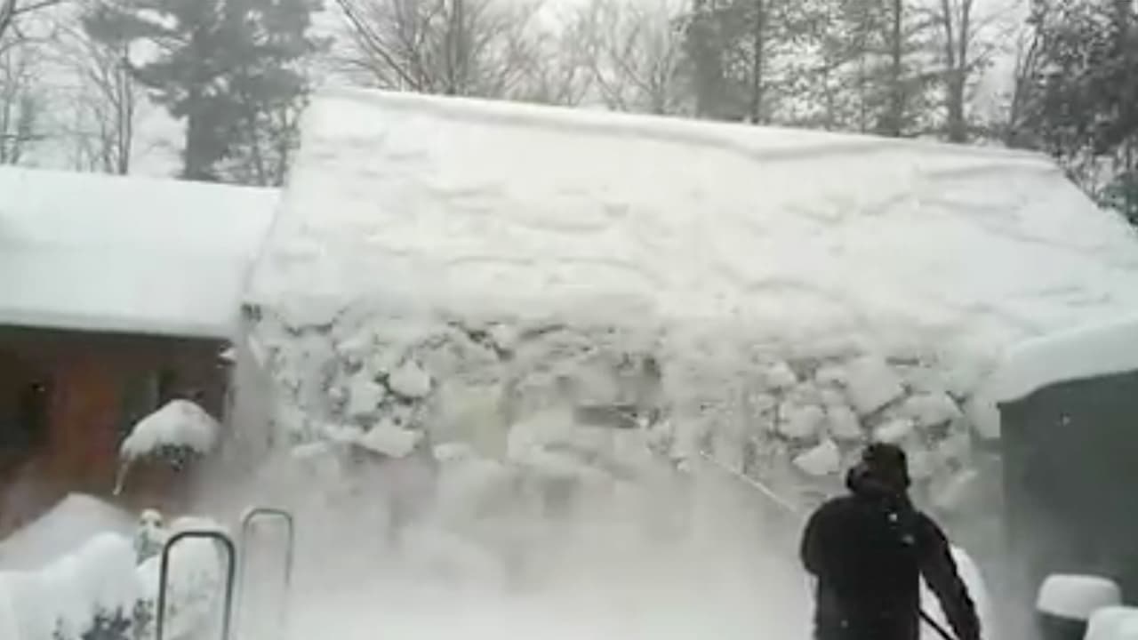 Como si fuera una avalancha, la impresionante caída de nieve del techo de una casa
