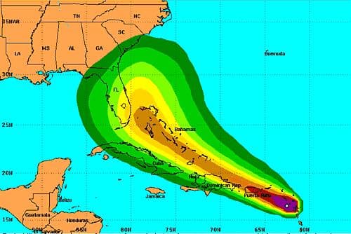 Aunque el cono de probabilidad sigue cubriendo a la península de la Florida, el más reciente pronóstico ubica al centro de Erika más al este, específicamente en aguas cercanas a la costa. Se espera que cuando la tormenta llegue a Florida esta haya incrementado su intensidad a huracán categoría uno.