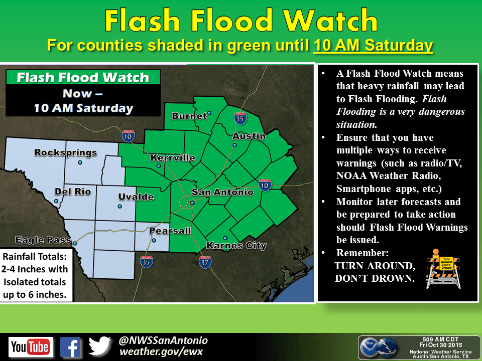Los principales condados bajo alerta de inundación repentina son Bexar, Comal, Hays y Travis.