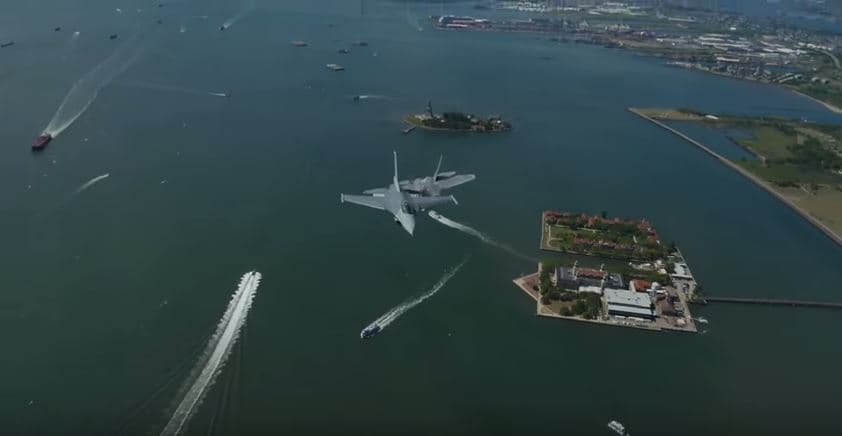 El video publicado por la Autoridad Portuaria de Nueva York y Nueva Jersey, muestra a los aviones F-16 y F-22 pasando sobre el borde del Río Hudson, a la altura de Harbor, y por la zona baja de Manhattan.