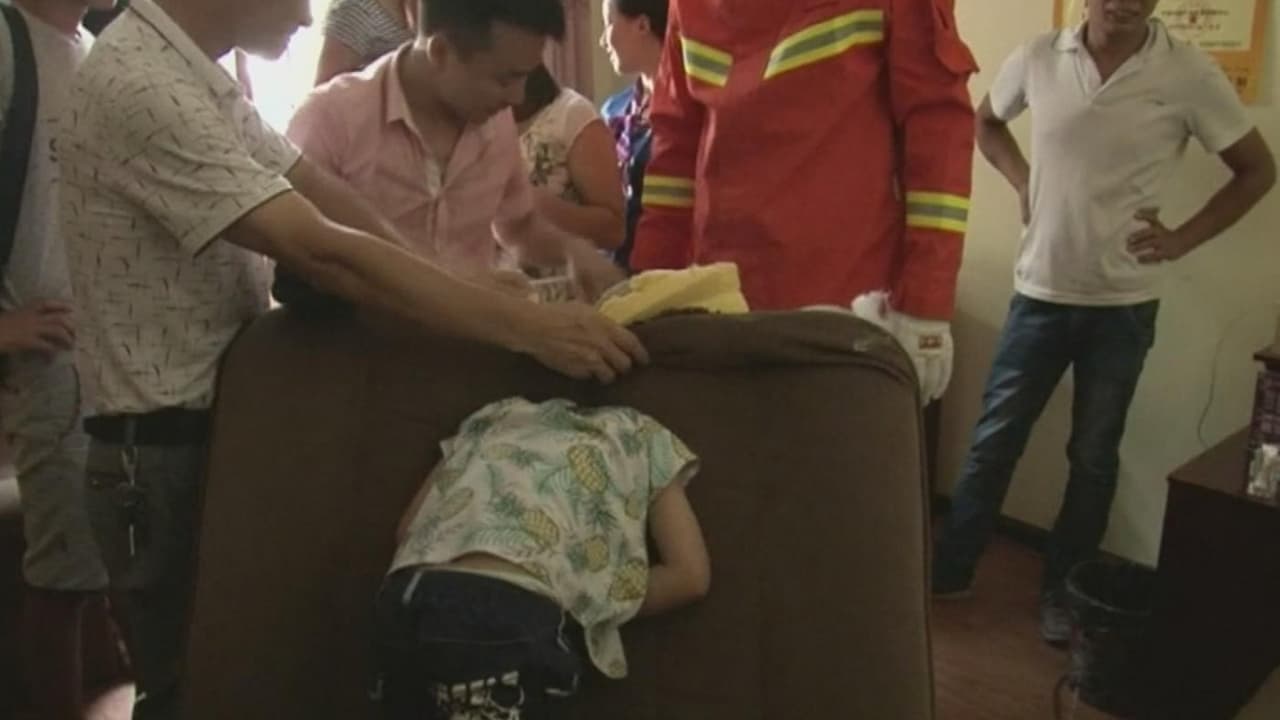 Los bomberos en la provincia de Guizhou, China liberaron a un niño de cuatro años que metió su cabeza en un hueco de un sofá en un salon de belleza. El niño no sufrió ningún tipo de lesión.