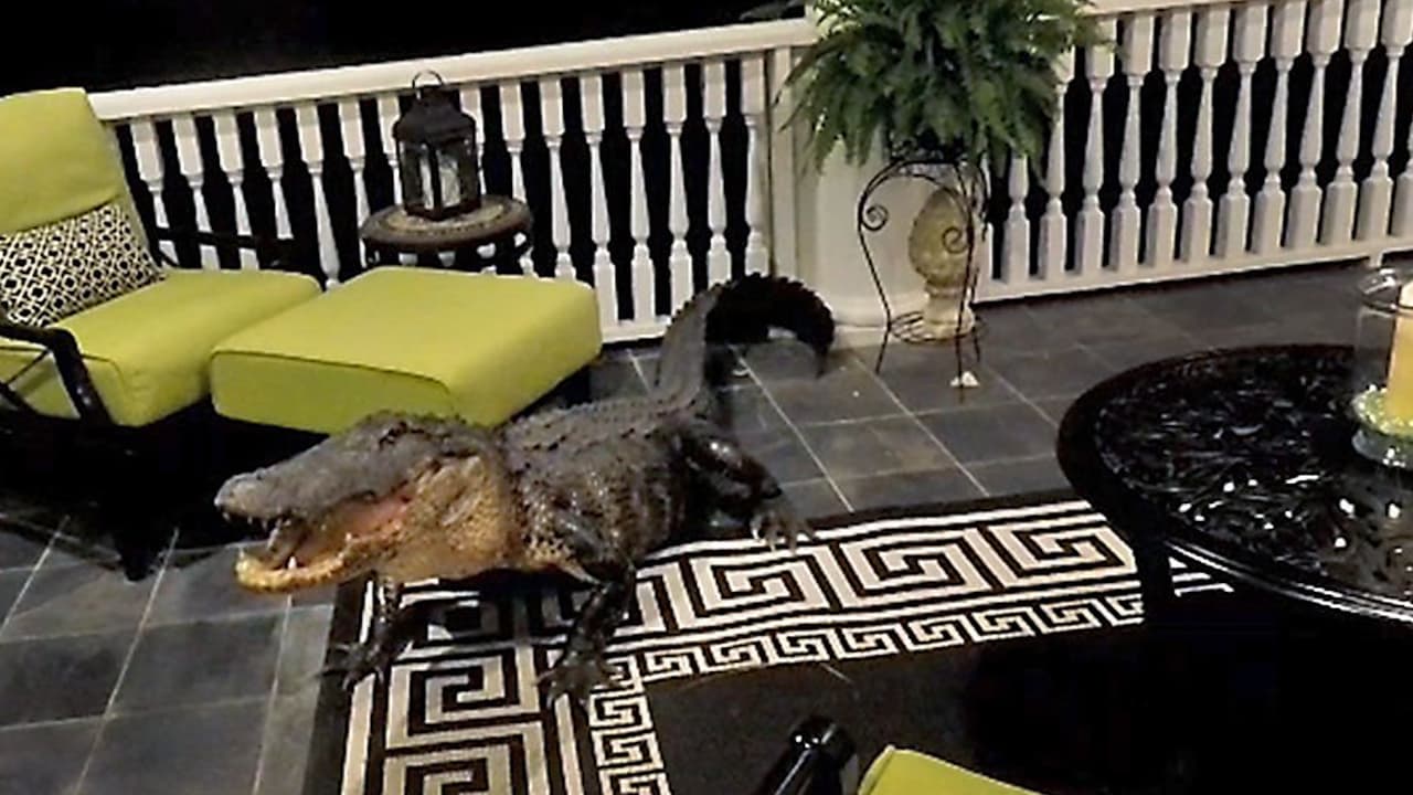 Steve Polston y su familia pensaron que alguien estaba intentado entrar a robar, pero cuando se acercaron a la puerta vieron un caimán de casi 10 pies en su porche.