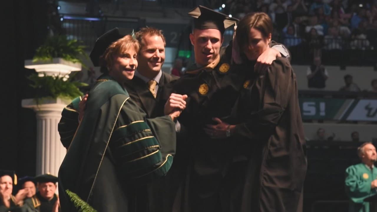 Sam Bridgman quien sufre de Ataxia de Friedreich, una enfermedad neuromuscular progresiva, se levantó de su silla de rueda con ayuda de sus compañeros de clase para recibir su título.