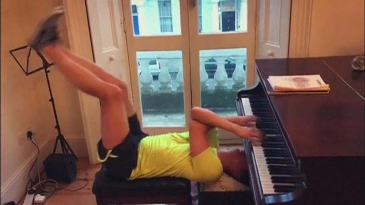 El pianista virtuoso Louis Schwizgebel practicó el preludio de Johann Bach mientras ejercitaba sus piernas. Eso sí, sin ver el teclado y en ropa de deporte.