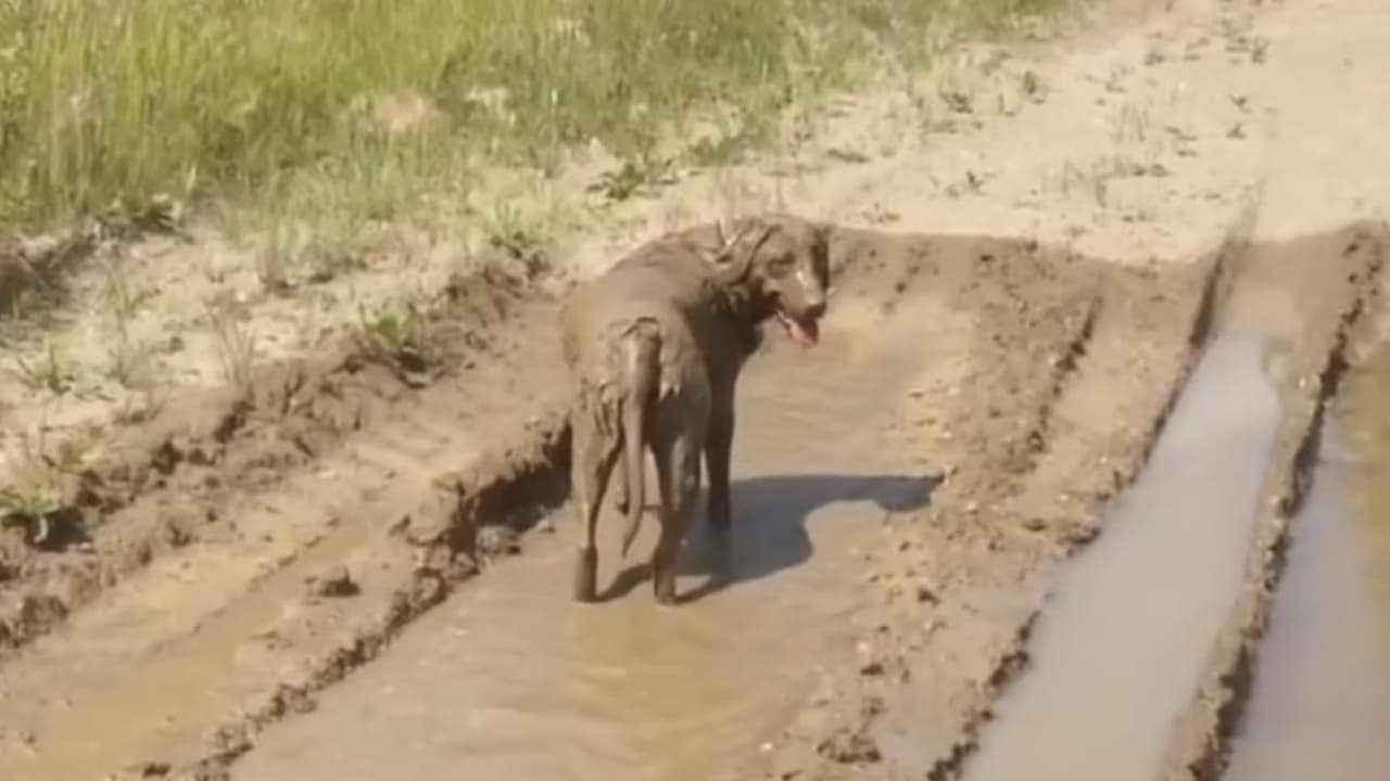 Este perro luego de una larga caminata y decidió saltar al camino lleno de barro para refrescarse. Su dueño solo pudo verlo mientras este disfrutaba y se llenaba de fango hasta las orejas.