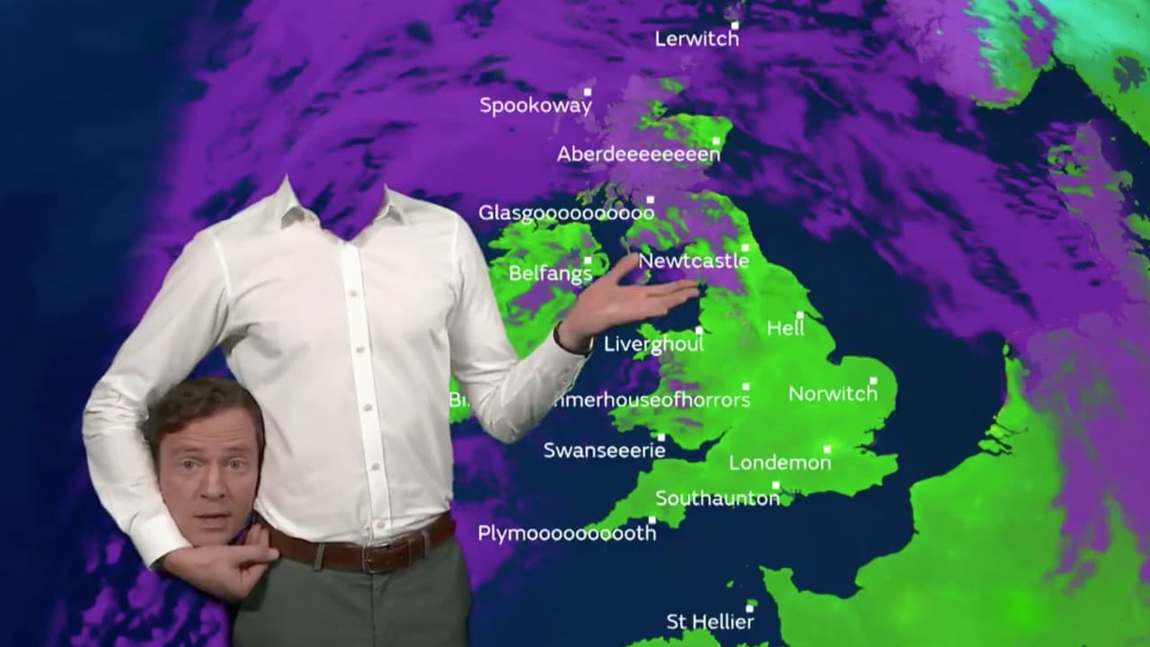Con el uso de una pantalla verde Alex Deakin, periodista meteorológico celebró Halloween inclusive pronosticando "lluvia de sangre" por todo Reino Unido.