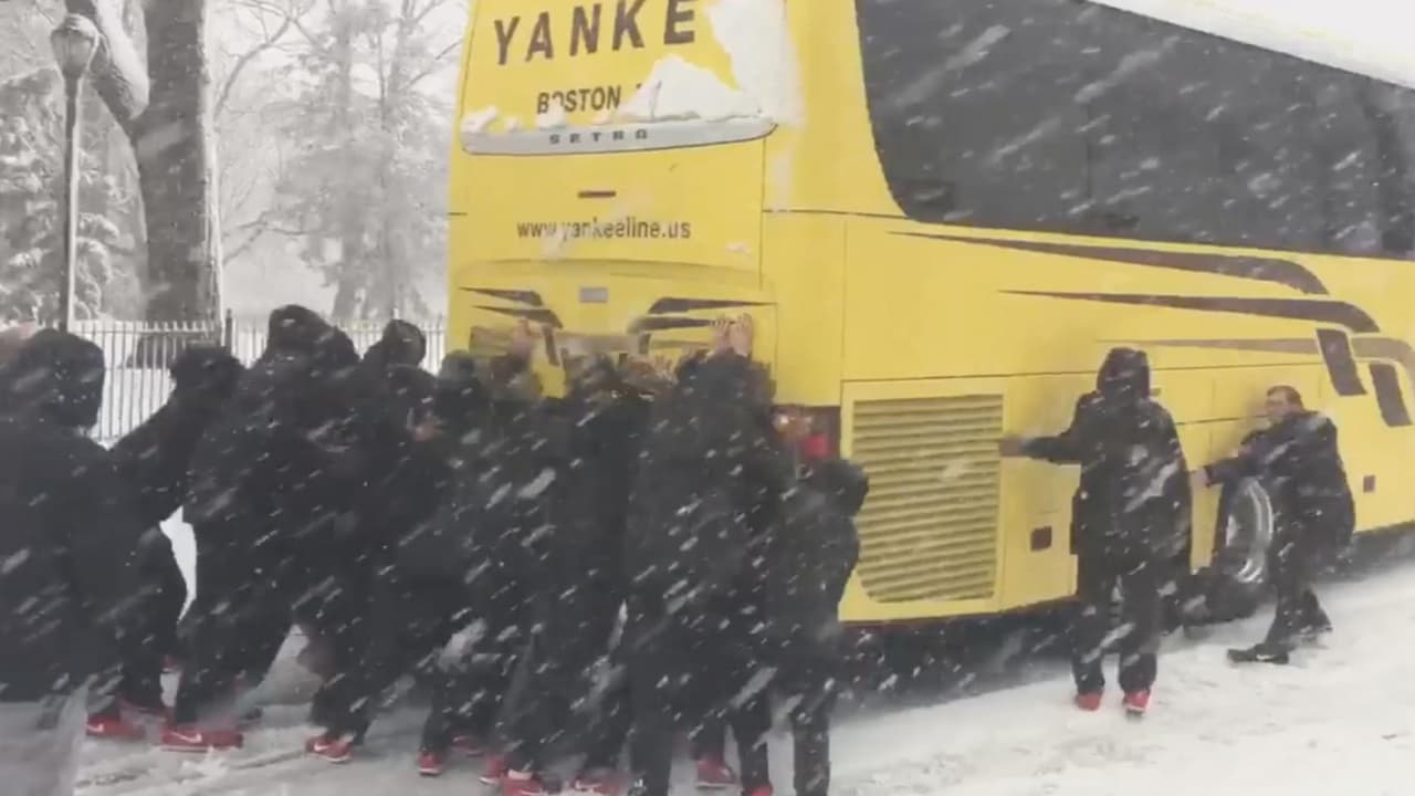 En plena tormenta de nieve este grupo de chicas logra empujar un gran autobús que se quedó atascado