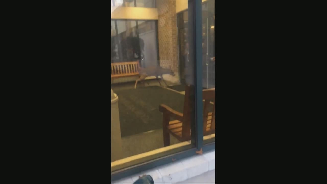 Los estudiantes de la escuela secundaria Ramapo en New Jersey quedaron sorprendidos tras encontrar un reno atrapado en la entrada del edificio.