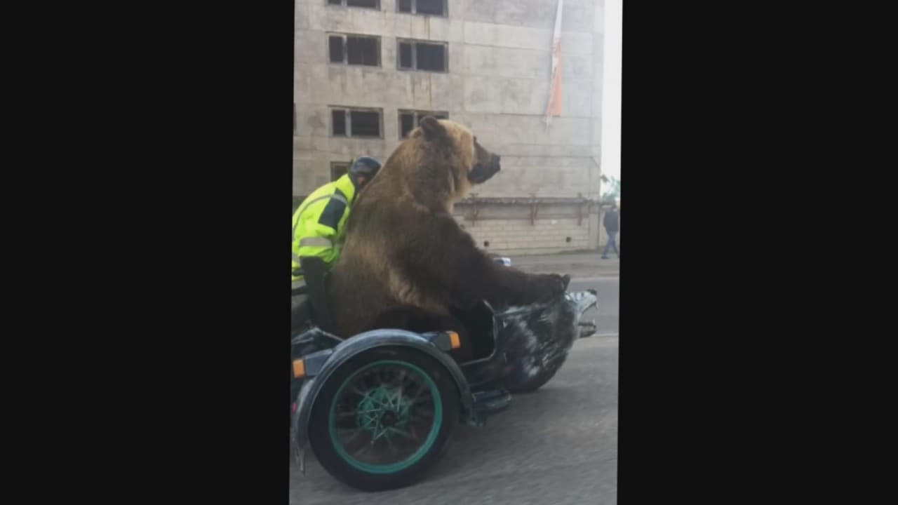 Este motociclista pasea con un enorme oso por las calles como si fuera un perro